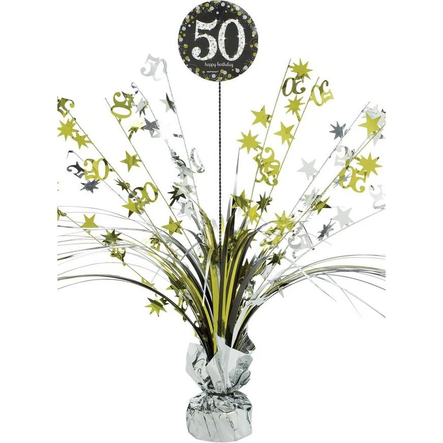 The birthday VIP will feel like a star when seated at a table decorated with a dazzling Sparkling Celebration 50th Birthday Spray Centerpiece. Featuring gold and silver “50” cutouts, this 50th birthday spray centerpiece has tall metallic wires you can fan out. The weighted base keeps it upright all night at your 50th birthday party.