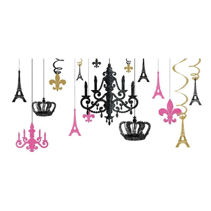 Your soiree is bound to be an elegant affair after decorating with the A Day in Paris Chandelier Decorating Kit! Complete with pink, black, and gold sparkly hanging decorations in the shapes of chandeliers, the Eiffel Tower, crowns, and fleurs-de-lis, this 17-piece set of trendy Paris-themed room decor will jazz up any space. Your guests will feel like they’re taking a trip to France when they see the room shine with sparkly cardstock decorations.