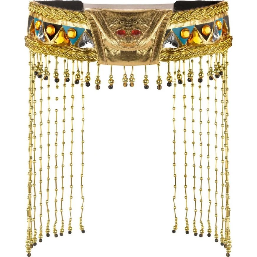 Walk into the costume party like an Egyptian wearing an Egyptian Headpiece for women! This headpiece is made of gold fabric adorn with gold strands and colorful plastic details. Wear a headpiece with other gold or colorful clothing (sold separately) to create your DIY Cleopatra costume. Everyone will be bowing down when they see you walking into the party wearing an Egyptian Headpiece! Dress and arm cuffs not included.