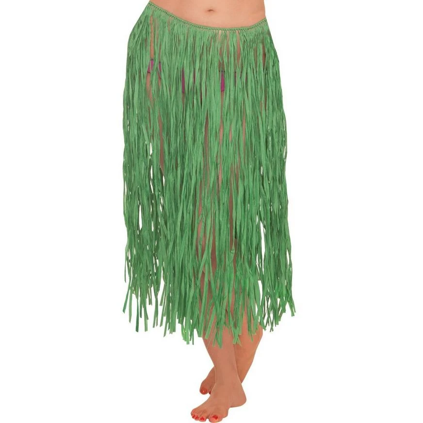 Be luau-ready with an island-style skirt! This skirt is faux green raffia for an authentic look and features an elastic waist.