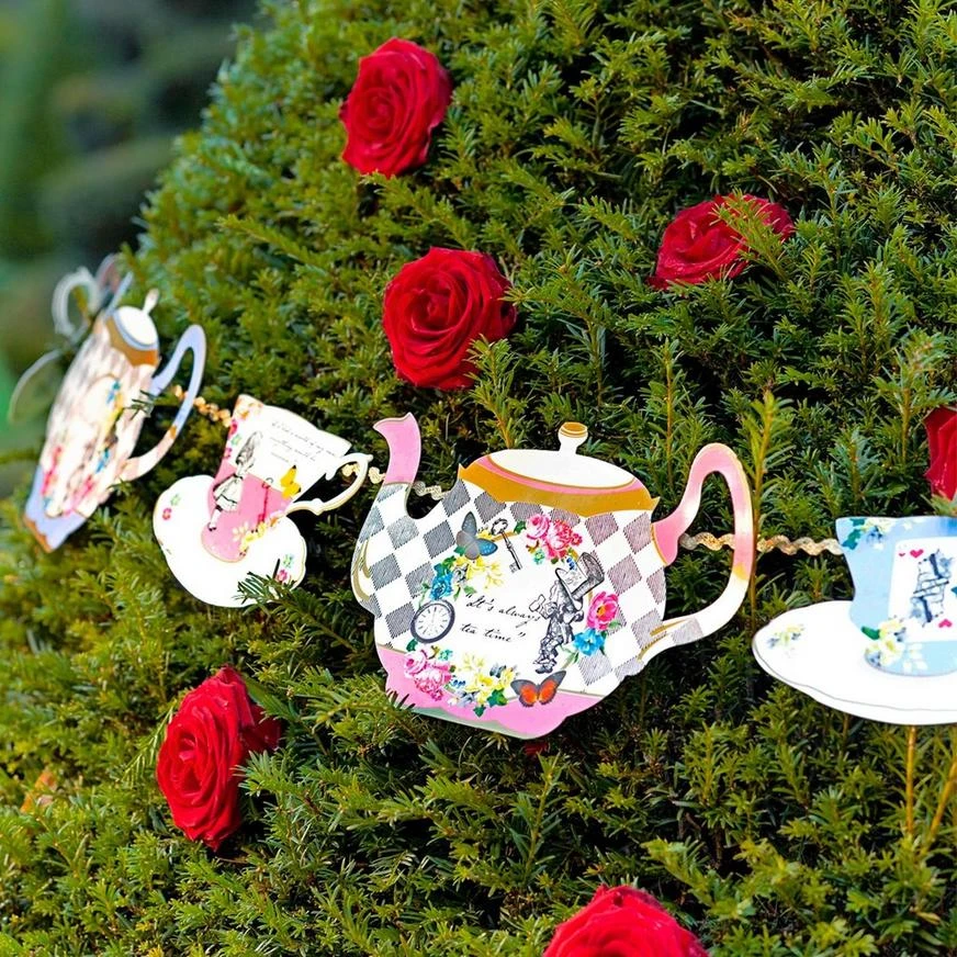 It’s always tea time! Decorate for your next tea party with an Alice in Wonderland Banner. This whimsical decoration features teapot and tea cup cutouts strung along a glittery gold string. Each cutout is printed with original illustrations from the book and beautiful pastel floral designs. This Alice in Wonderland decoration is the perfect addition to your mad tea party.