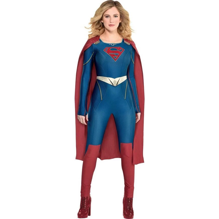 Show off your strength as the mightiest heroine from Krypton — Supergirl! This costume is based on the hit tv show Supergirl and features a blue suit with rear zip closure and a long red cape. The iconic red ‘S’ is printed on the front and a decorative gold belt applique completes the superheroine look.