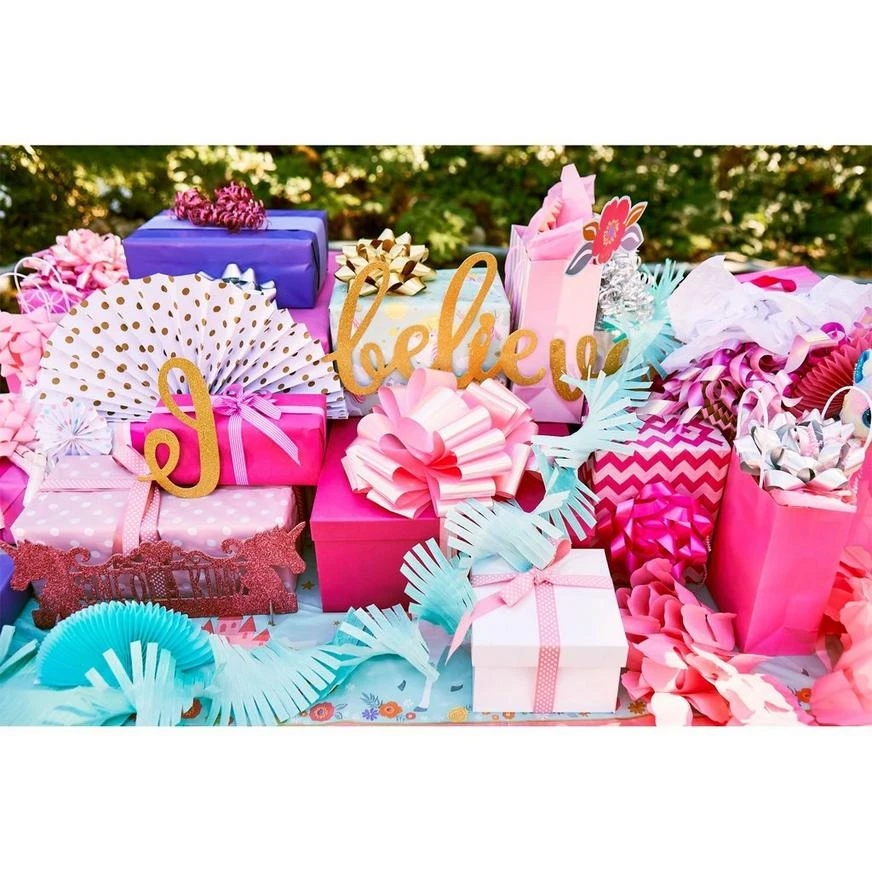 Make your little one’s unicorn birthday party shine by decorating it with a Glitter Gold Magical Unicorn Letter Banner! A letter banner featuring unicorn heads and an “I Believe In” headline covered in gold glitter will add some decorative shine to your child’s unicorn party. Hang this unicorn banner on the walls, stair railings, or anywhere else in your child’s unicorn birthday party!