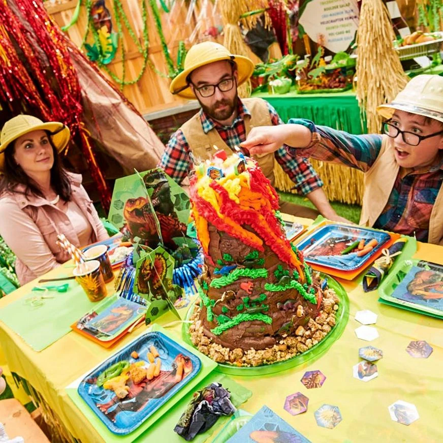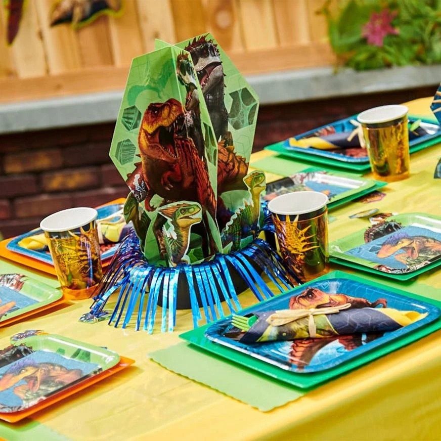 Bring a slice of the Jurassic Park to your little one’s party with this Jurassic World Table Decorating Kit! Start by assembling the 3D Indominus rex and T. rex cardstock centerpiece, complete with its base of shiny blue foil frill. Add the smaller blue and green cardstock centerpieces before sprinkling the table scatter, complete with an array of different dinosaurs printed on them, around the table. Make your little one’s Jurassic World birthday party one to remember by setting up these dinosaur decorations on the lunch table!
