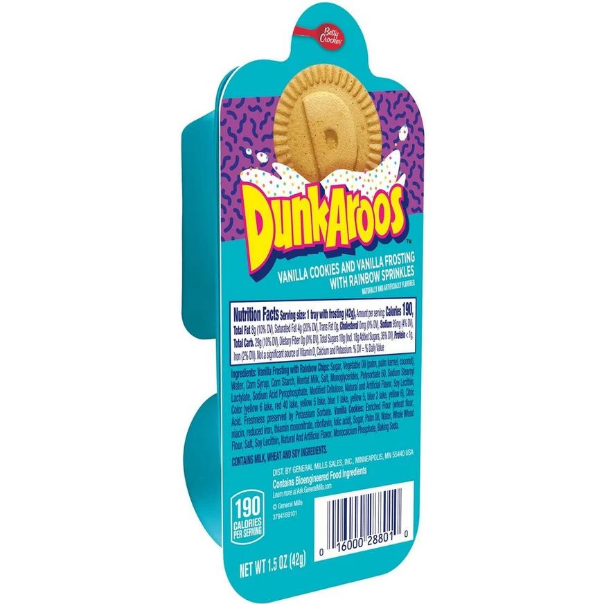 Enjoy the latest dunking cookie sensation: Betty Crocker Dunkaroos! This snack pack has 12 vanilla cookies and a pocket of rich vanilla frosting with rainbow sprinkles for delicious dunking fun.