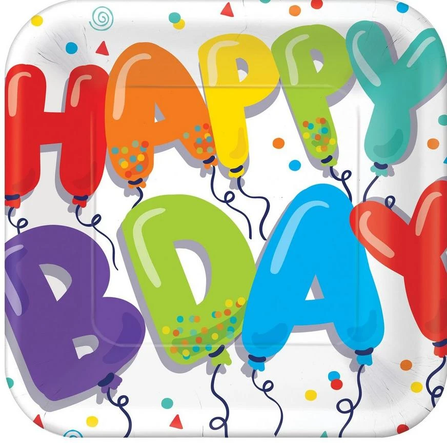 Serve up a delicious lunch on square plates. These paper plates feature the headline “Happy Bday” with colorful letter balloon font surrounded by a confetti design against a white background is a classic birthday look. Arrange them when you set the table or stack them up on the buffet table so guests can help themselves.
