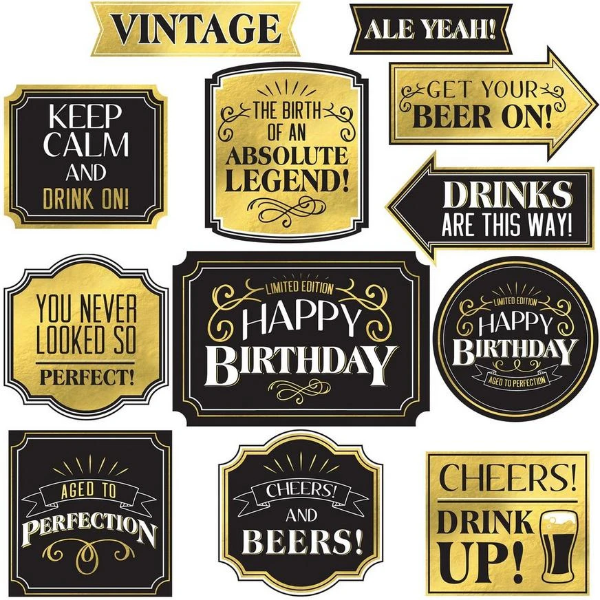 Add a little humor to their milestone birthday with this cutout set. The black and metallic gold cardstock signs feature cheeky phrases like “Vintage,” “Ale Yeah,” “Aged To Perfection,” and more.