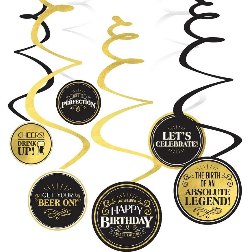Add a fun texture to the venue with hanging swirl decorations! The cardstock spirals feature circle cutouts with catchphrases like “Aged To Perfection” and “Get Your Beer On” in black and metallic gold.