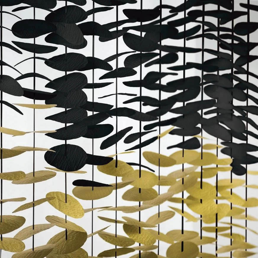 Add a stylish layer of color and texture to your next decorative backdrop with black and gold hanging circle decorations! These string decorations feature black and gold tissue paper circles attached to long strings. Hang this black and gold circle curtain by the attached gromets for an eye-catching photo backdrop.