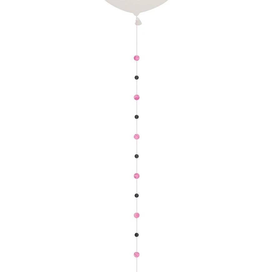 Create a unique balloon bouquet decoration for any party with a Black and Pink Circles Balloon Tail! This balloon tail features pink plastic circle cutouts alternating with small black cardstock circle cutouts covered in glitter. You can tie this to a balloon bouquet and a balloon weight to decorate for your birthday party, anniversary, or any other special occasion!