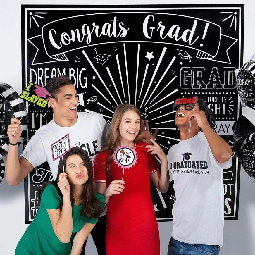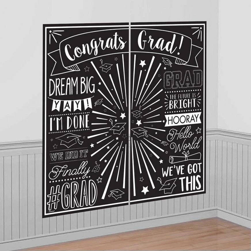 Set the scene for celebratory selfies with a Black & White Graduation Scene Setter! This plastic wall decoration includes two plastic banners that feature a black background with phrases such as “Dream Big,” “Finally,” and “Hooray” in white, plus a large headline at the top that reads “Congrats Grad!” Suitable for both indoor and outdoor use, a Black & White Graduation Scene Setter makes a great photo background and can be combined together and attached to any flat surface using tape or Sticky Tack (sold separately). Measures 65in x 65in when assembled.