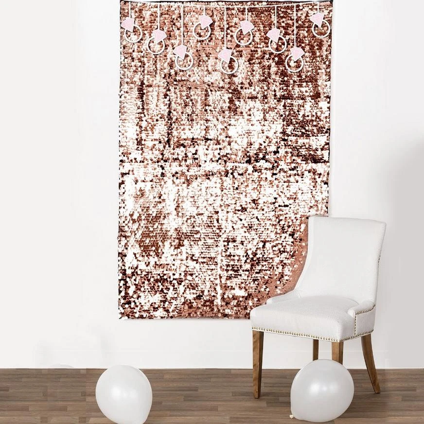Have a little photogenic fun at the bachelorette party with the Blush Sequin Backdrop! This polyester backdrop is covered in rose gold sequins and features a pink diamond ring banner at the top.