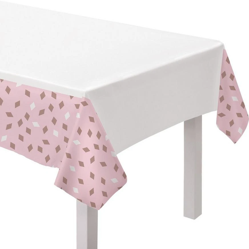 Set the foundation for a colorful party with a blush table cover. The plastic table cover features a pink border with scattered diamond confetti and a white center, so your tableware takes center stage. After the party, wipe it down so you can use it again or simply toss it for easy cleanup.
