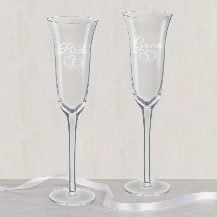 Raise a glass to happily ever after with Bride & Groom Wedding Toasting Glasses! These glass champagne flutes feature flared rims with “Bride” and “Groom” in gray script. Each wedding champagne flute includes a pair of interlocking hearts right below the text. Elegant and classic, these wedding glasses can be used long into happily ever after.