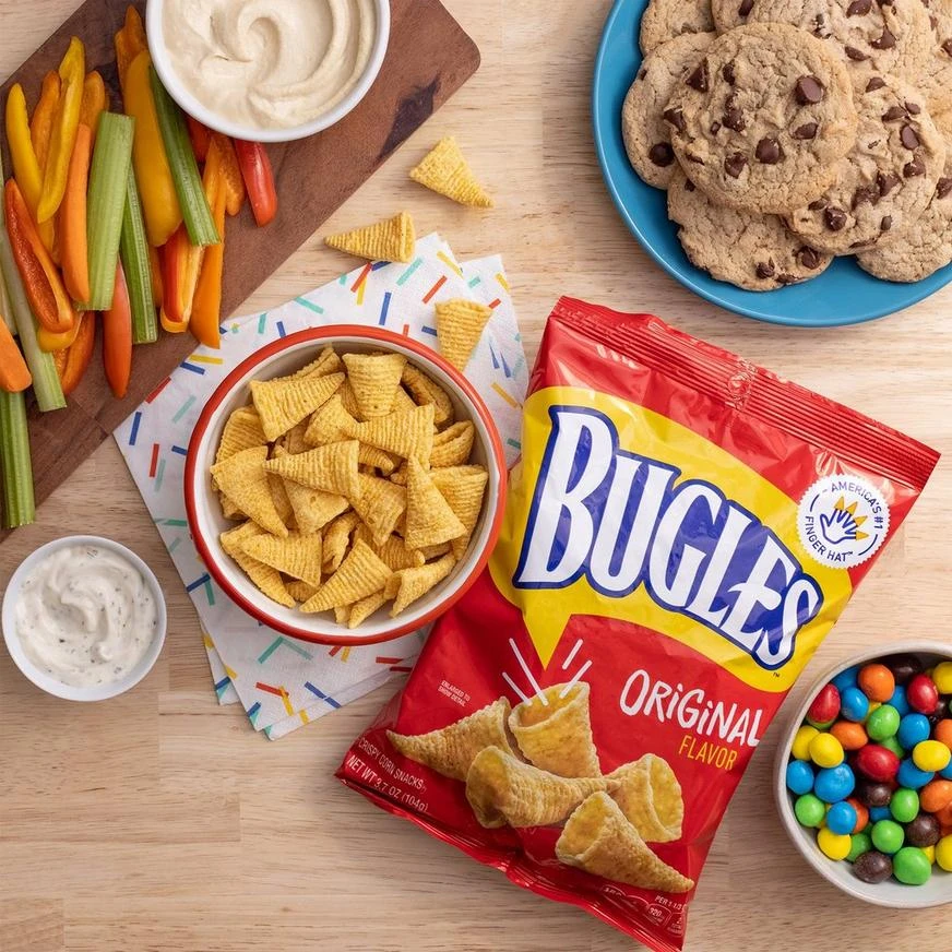 Bugles Original Flavor snacks are made with crispy corn and contain no trans fat. They can be used to create fun and tasty recipes the whole family will love. America’s #1 Finger Hat!