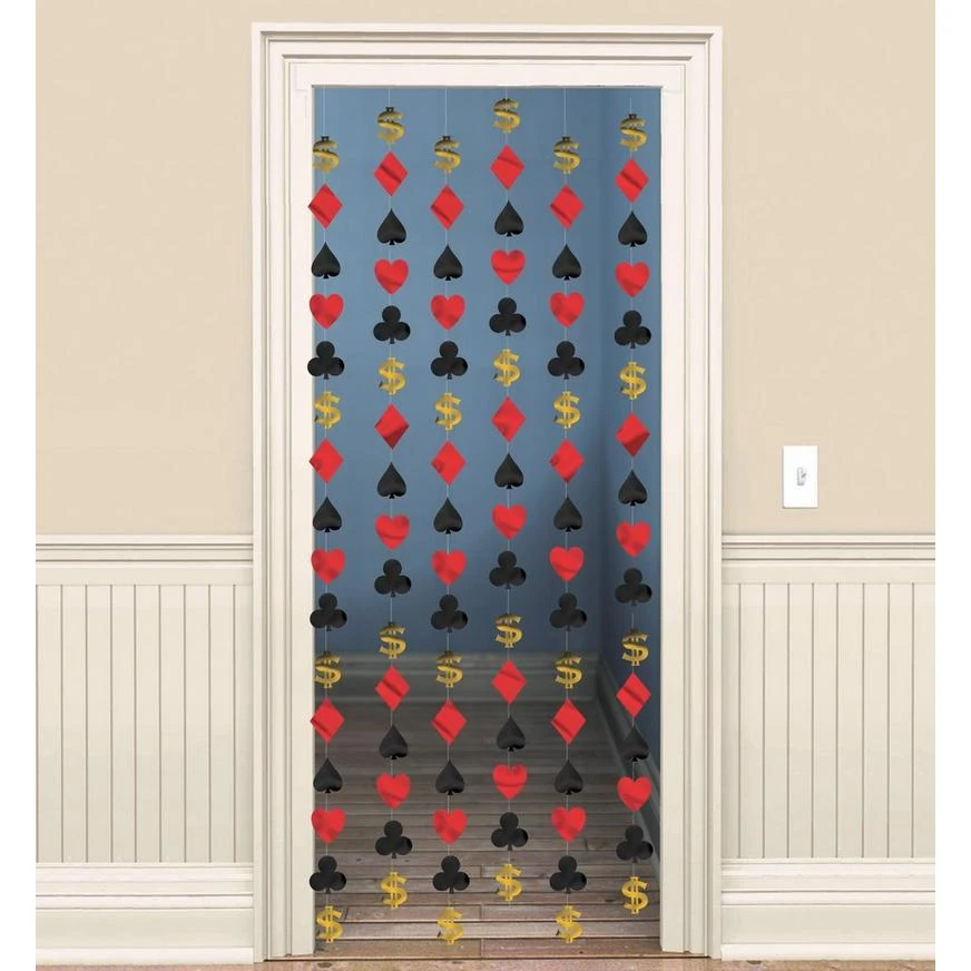Your casino party will turn into a full house with Casino String Decorations! These hanging decorations feature die-cut red diamonds and hearts, black clubs and spades, and gold dollar signs, all attached to long strings. Hang Casino String Decorations from a doorway or the ceiling to add a festive feel to your casino party or Las Vegas-themed party.