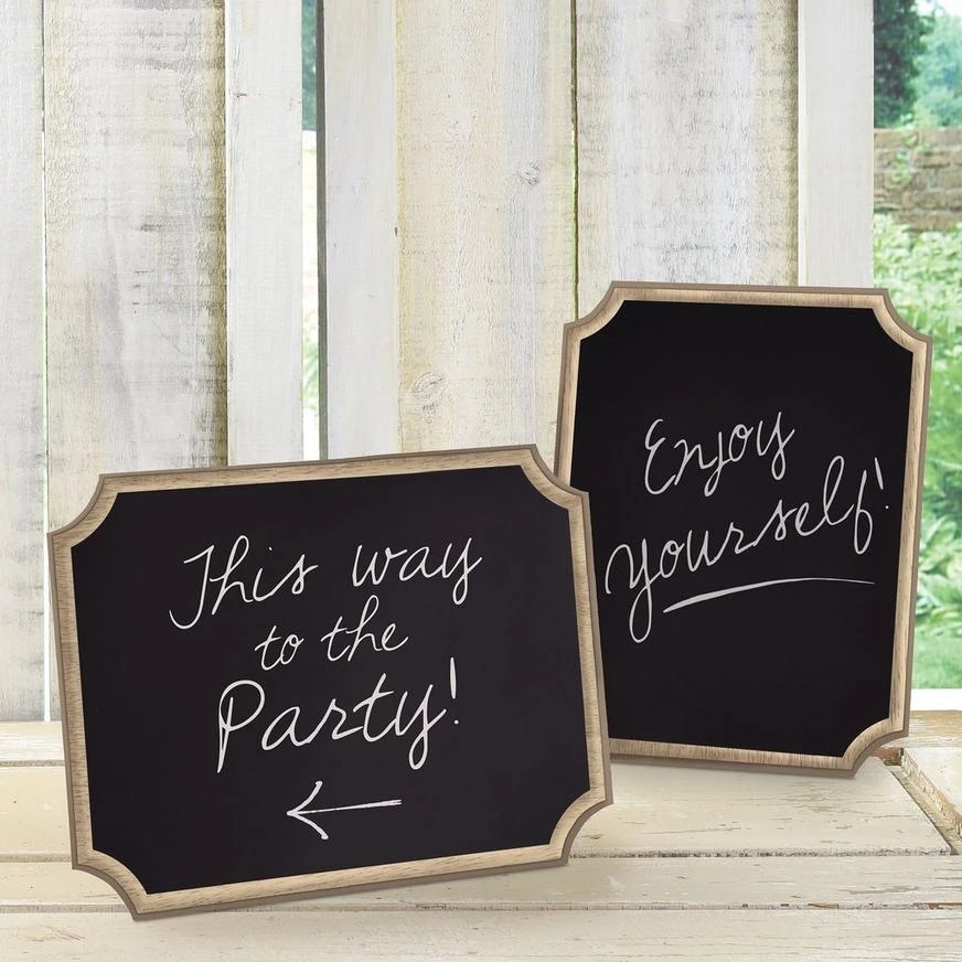 Put your message on display in an elegant way using these Chalkboard Wood Easel Signs! These chalkboard decorations are small wood signs with a black space in the middle that have a scroll-like border to give off a classy look. Using chalk or a white marker (not included) you can write a special message for your wedding, shower, anniversary party, or special event. Using the easel stands, display these chalkboard signs as guests enter your party.