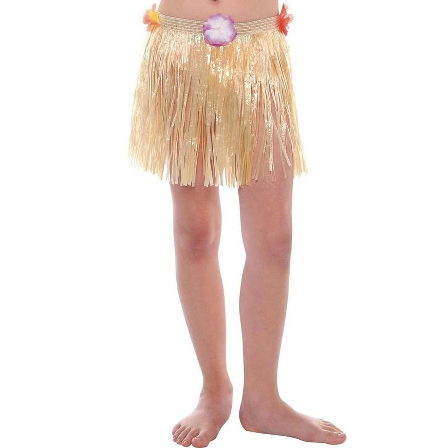Get shaking, kids! This Plastic Mini Faux Grass Skirt for kids features plastic “grass” strands with the look of natural raffia, and is finished with fabric hibiscus details at the stretch waistband. Our plastic grass skirt is one essential for your luau or summer party!