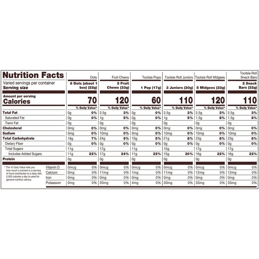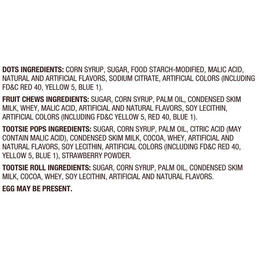 - 4 assorted candy types: Tootsie Roll, Tootsie Pops, Tootsie Fruit Chews, and Dots