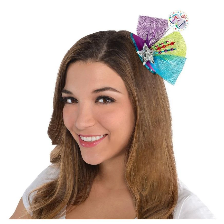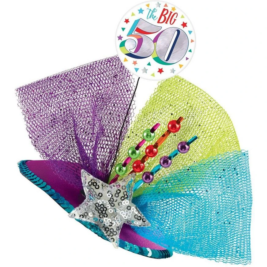 Make sure they’re the fanciest one at the party by surprising them with a Clip-On Prismatic Rainbow 50th Birthday Fascinator Hat! The clip-on hat features a purple base with a blue sequined trim, vibrant netting and beaded accessories, and a cardstock cutout that reads “The Big 50.” Simply use the attached alligator clips to to secure the hat in place and let the birthday festivities begin!