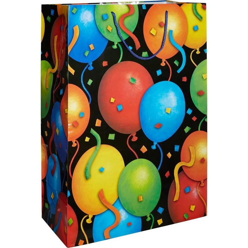 Wish them the happiest of birthdays with this Colorful Balloons & Confetti Gift Bag! The black paper gift bag features vibrant balloons and confetti. Its blue rope handle make it easy to transport. Put clothes, toys, and other birthday presents in this gift bag and it’s instantly ready for giving!