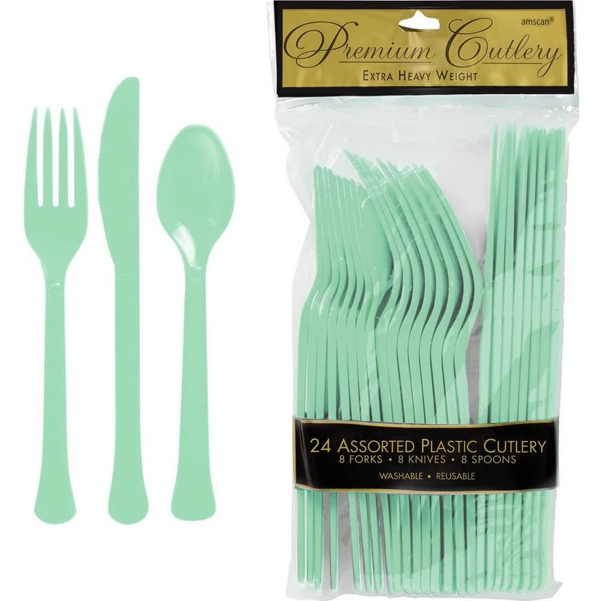 Give your guests a premium dining experience! This Cool Mint Premium Plastic Cutlery Set has plastic forks, knives, and spoons for a party of eight. This plastic cutlery is made of durable plastic — perfect for a variety of party foods. These plastic utensils are washable and reusable for all of your Cool Mint-themed special occasions! Not suitable for boiling hot liquids, microwave use, or dishwasher use.