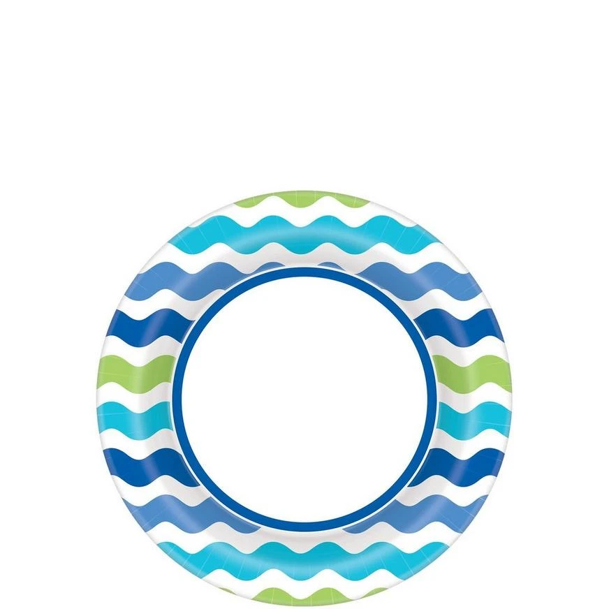 Wave friends and family over — the dessert has been served on Cool Wavy Stripes Dessert Plates! Featuring blue, green, and white squiggly stripes around a white center, these small round paper plates are perfect for your beach party or summer picnic. Guests will love eating luau appetizers or delicious desserts off these wavy summer plates.
