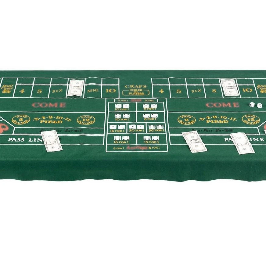 Hit your lucky 7 and 11! The Craps Table Cover transforms an ordinary tabletop into an instant gaming hotbed. Made of green felt with a silk screen print of an actual craps table, the table cover has a blank reverse side for card games or whatever else your casino night requires. Game instructions are printed on the back of the package, so you’re ready to play at your casino night.