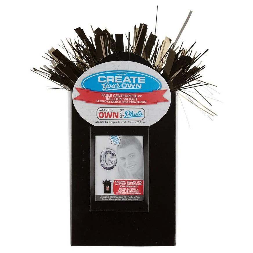 Make any party special by decorating it with a Create Your Own Black Balloon Weight Centerpiece! This cardstock centerpiece is designed to look like a black tote bag with strips of black foil fountaining out of it. You can attach balloons (sold separately) to the handles or to the loop on the inside of the centerpiece decoration. The front of the balloon weight centerpiece has a small frame to insert pictures. Use this centerpiece to add a personalized touch to the rest of your party decorations! Balloons, balloon cups, and stick not included.