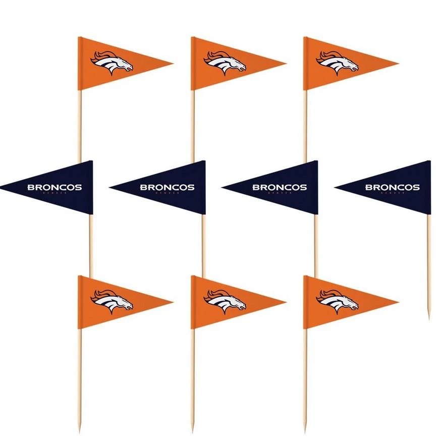 Take your pick of game-day snacks with these Denver Broncos Flag Picks. Each pick features a small paper pennant flag with the team’s colors and logo. Use these party picks to decorate cupcakes or to hold sandwiches together for team parties, game days, or sports-themed birthdays.