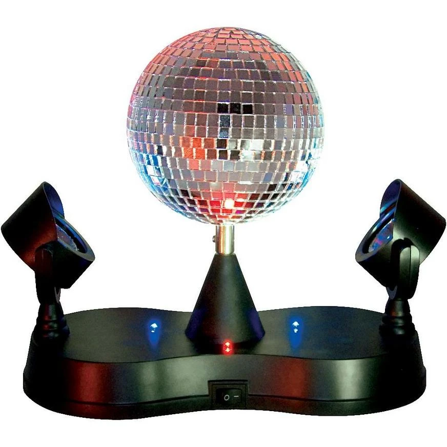 Create instant party light magic! This Disco Mirror Ball Party Light features a five inch mirror ball that rotates, reflecting the beams of two multi-colored LED mini spotlights and four LED lights in the base. Each LED spotlight contains six bulbs of various colors for a truly brilliant show. Set up this party light to wow guests during any celebration. Disco Mirror Ball Party Light weighs 1.4 pounds. Not sound activated.
