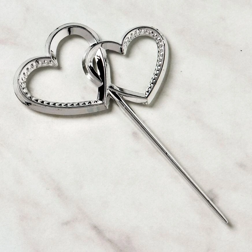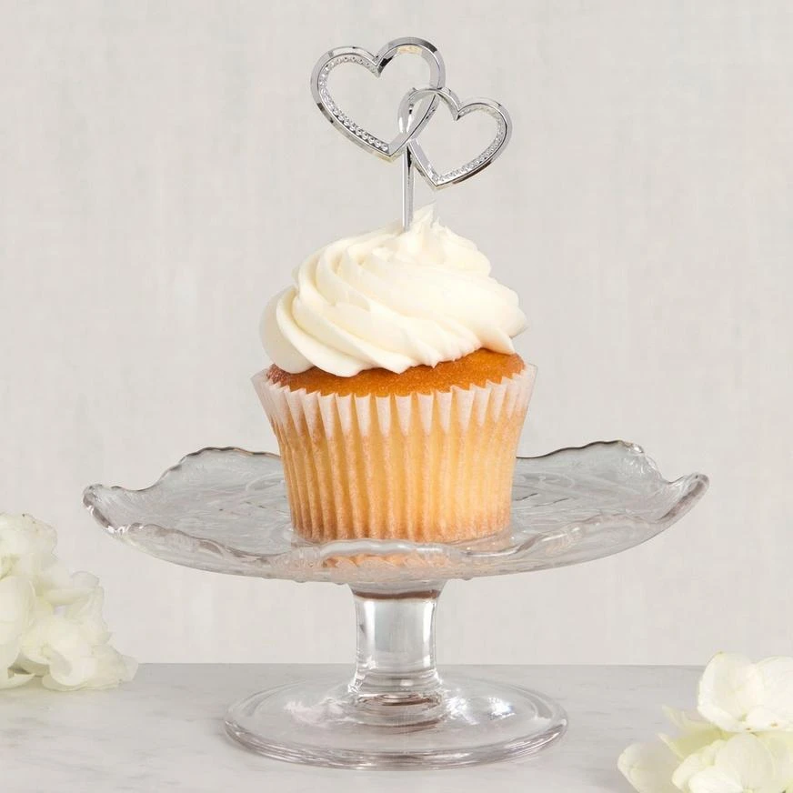Decorate your wedding cakes and cupcakes with Double Heart Party Picks! These plastic picks feature interlocking hearts with an electroplated silver finish for a sleek and sparkling look. Perfect for your wedding day, these heart-shaped cupcake picks can even be saved for anniversaries to come.
