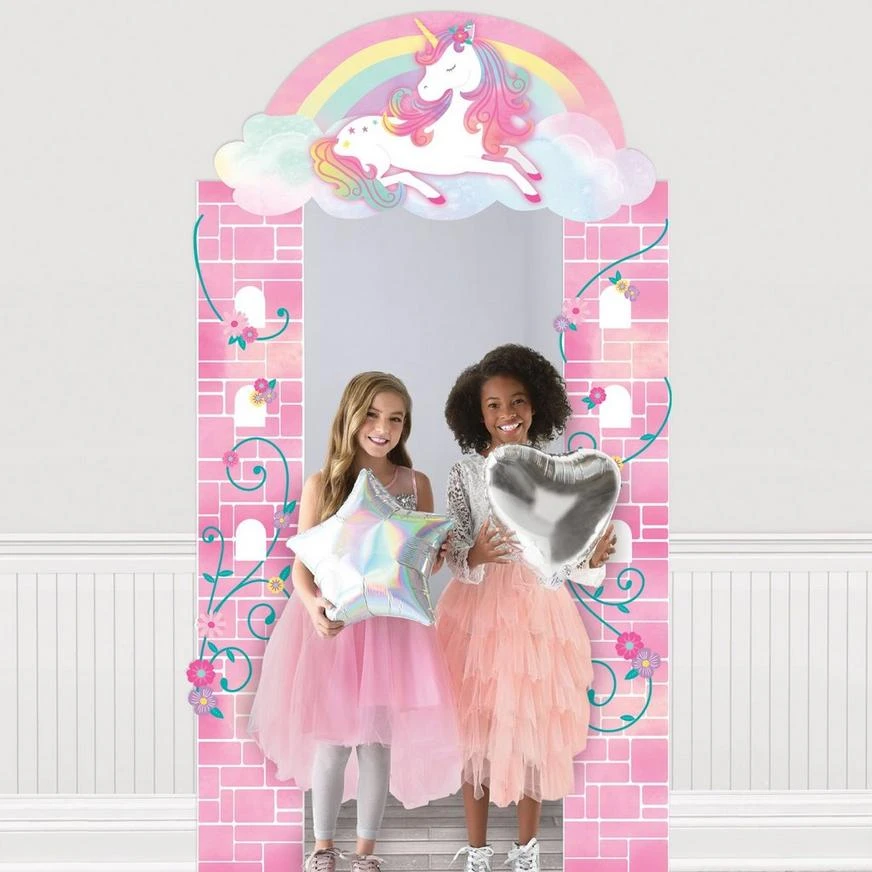 Create a fairyland entryway for a fairytale birthday with the Enchanted Unicorn Archway! This cardstock decoration looks like an enchanted archway that leads to a magical land of unicorns. It features a pink brick façade and a rainbow unicorn lying on a cloud beneath a rainbow.