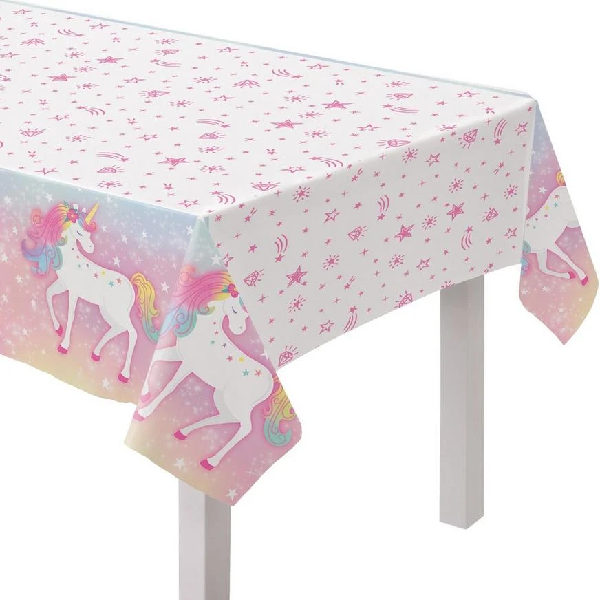Prepare the table for a magical birthday party with the Enchanted Unicorn Table Cover! This plastic table cover features colorful enchanted unicorns on the sides and a pattern of pink stars against a white background on the center.