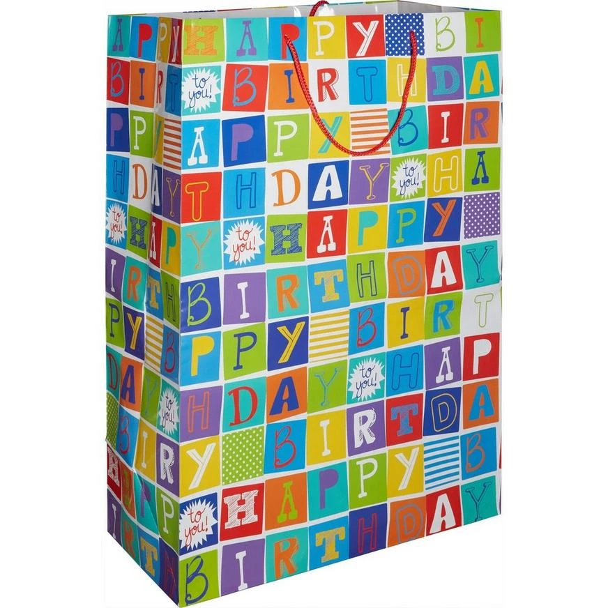 Celebrate big time with this Giant Happy Birthday Squares Gift Bag! This glossy white gift bag with red braided rope handles features squares in a variety of colors and patterns. On each square is an individual letter of the headline “Happy Birthday.” Give a perfectly packaged present every time!