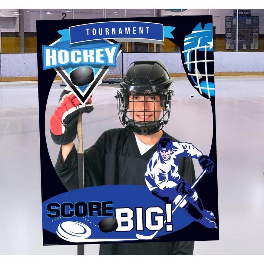 They’ll cheer you on and shout when you show up with a Giant Hockey Photo Booth Frame for their party! This large cardboard picture frame features a hockey theme complete with a blue background, pucks, a hockey player, and a “Tournament Hockey, Score Big!” headline that is printed on the border. Using the large cutout space in the center, you can pose like your favorite player or take pictures with your team. Display this sports photo prop during their hockey party, or use it for a fun photo booth prop at any sports-themed party.