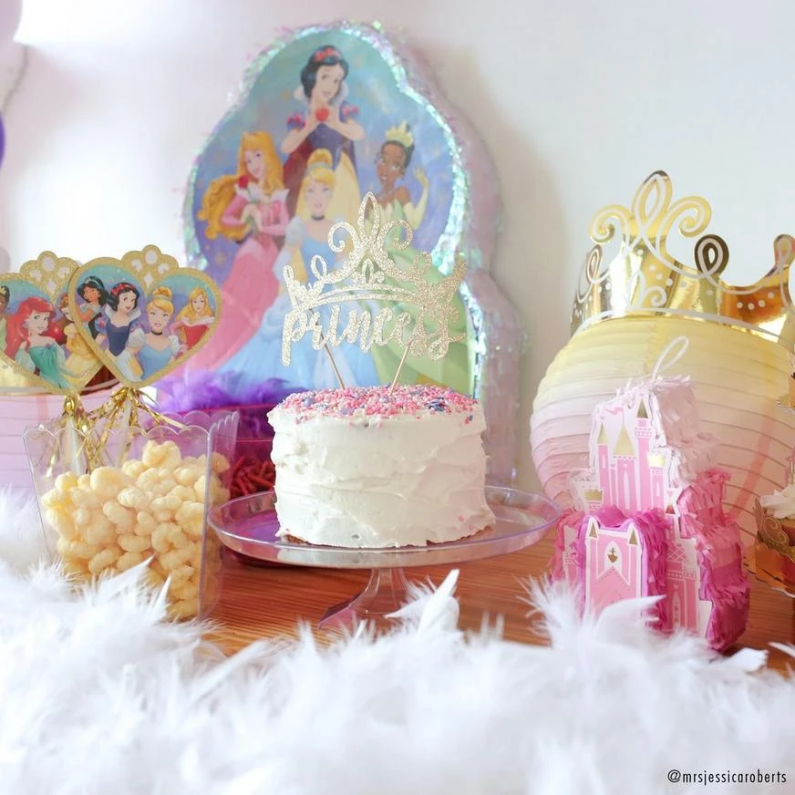 Make sure your princess’s cake is fit for royalty with a Glitter Disney Once Upon a Time Princess Cake Topper! The cardstock crown sits atop the headline “Princess” and both are covered in shimmering gold glitter. Attach the wooden sticks to the back of the cutout to assemble the cake topper and secure it in place. It’ll be a shining scene when you decorate your cake with a princess tiara cake decoration!