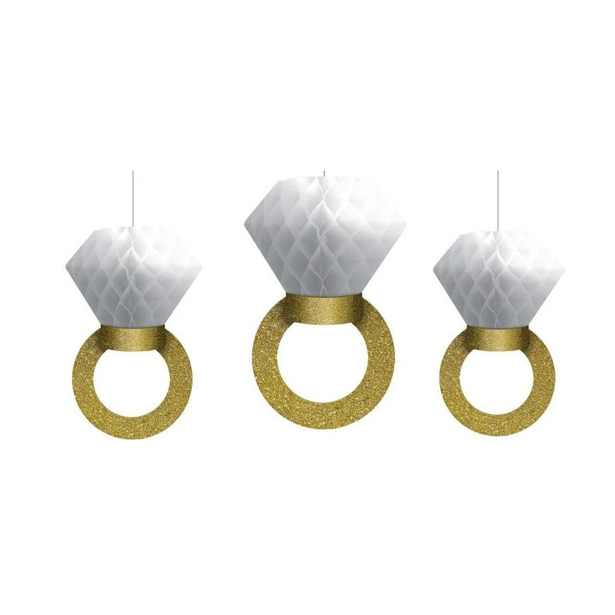 Put wedding bling on your ceiling with Glitter Gold Diamond Ring Honeycomb Balls. These wedding decorations feature cardstock rings covered in gold glitter topped with white diamond-shaped honeycombs. With the attached strings, the Glitter Gold Diamond Ring Honeycomb Balls can easily be displayed from the ceiling or trees to make a beautiful wedding decoration.