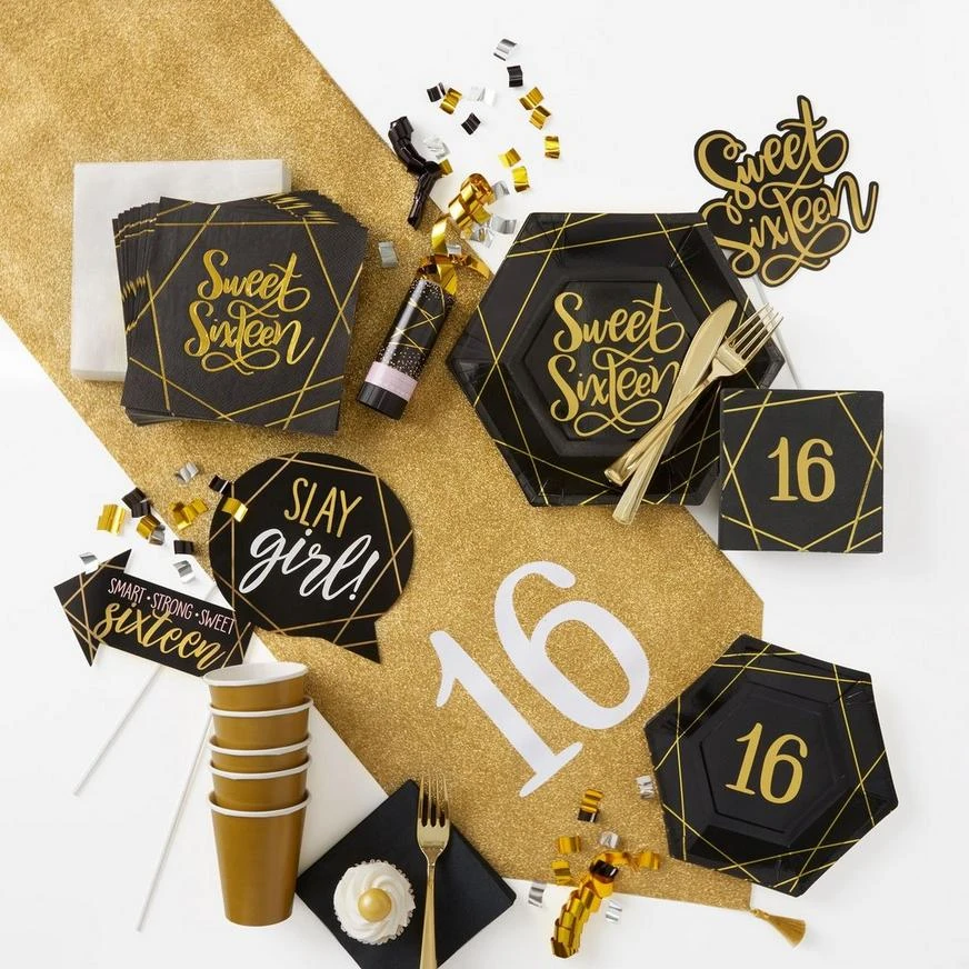 Create a shining tablescape with this Glitter Gold Sweet 16 Table Runner! The 6-foot long fabric table runner features the number “16” printed at either end on a background of gold glitter. Hanging just below is a golden tassel, which adds the perfect detail to an already stylish table runner. Set it down to serve as the base of an elegant centerpiece or simply use it as an eye-catching way to decorate the special day.