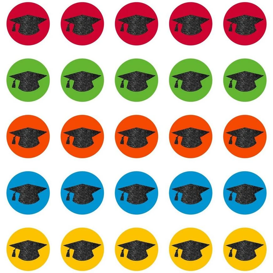 Toss your cap, grad! These Glitter Multicolor Graduation Cap Cutouts are two-sided cardstock cutouts with glitter on one side. Easy to attach to walls, windows, and doorways with tape or Sticky Tack (sold separately), mini graduation cutouts are sure to brighten up your home and celebration!