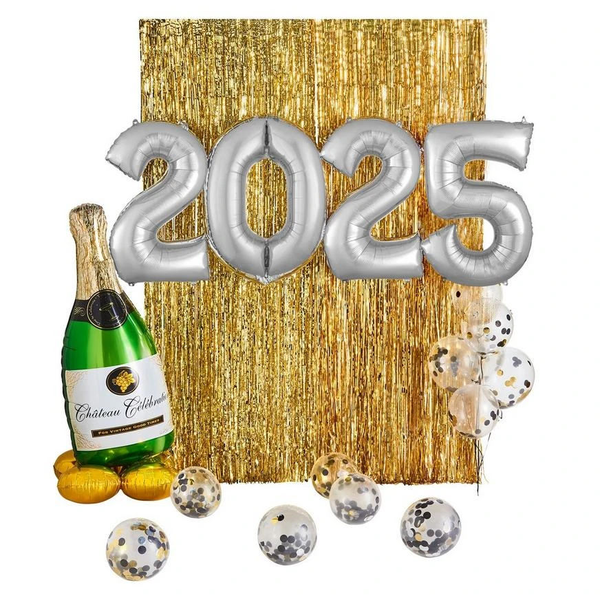 - Step 2: Attach the Silver Number Balloons, centering them across the curtains.