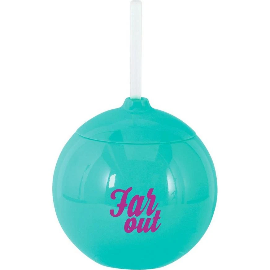 Enjoy a delicious beverage at your 70s-themed party in this Good Vibes 70s Ball Cup with Straw! The round plastic cup is a vibrant teal color with the headline “Far Out” printed on it in bright pink. You can use this cup to enjoy your favorite throwback beverages or give it out as a party favor at your 70s-themed party or birthday celebration!