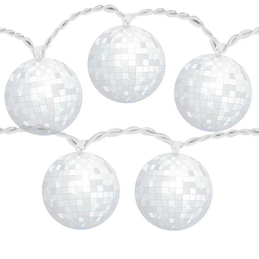Make your 70s-themed party shine a little brighter by hanging up these Good Vibes 70s Disco Ball LED String Lights! The string lights feature bulbs sandwiched between two plastic attachments printed like disco balls. String the lights along a wall or table or incorporate them into a groovy 70s-themed centerpiece!