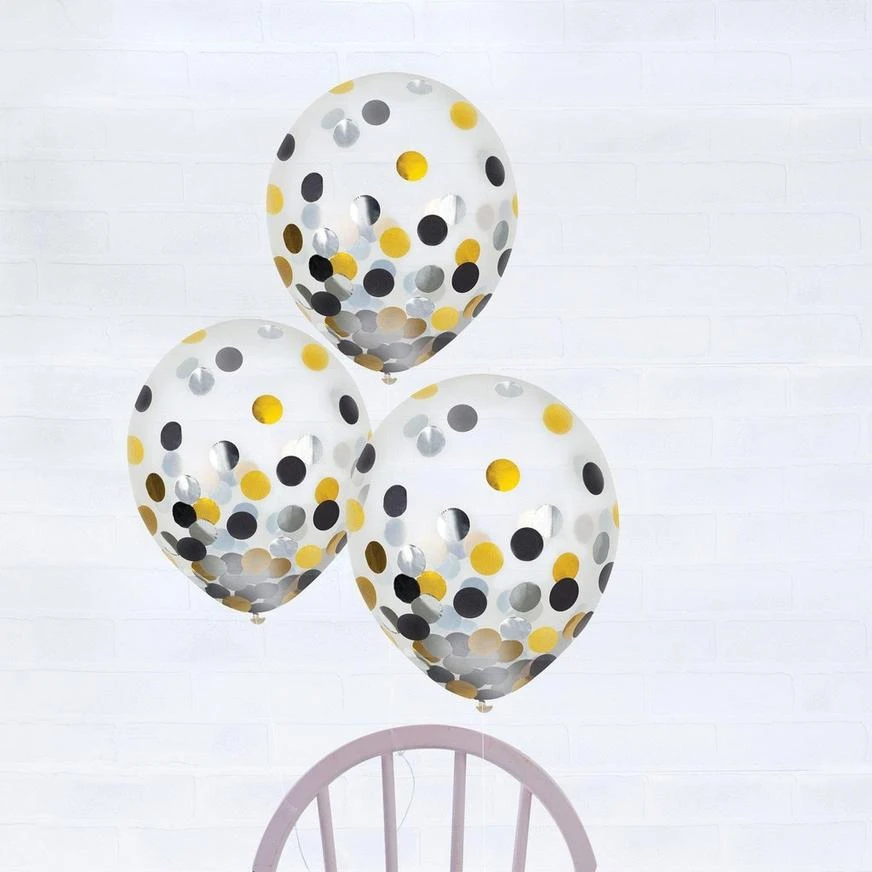 | 12 | 6ct, 12in, Black, Gold & Silver Confetti Balloons (SKU 811633) |