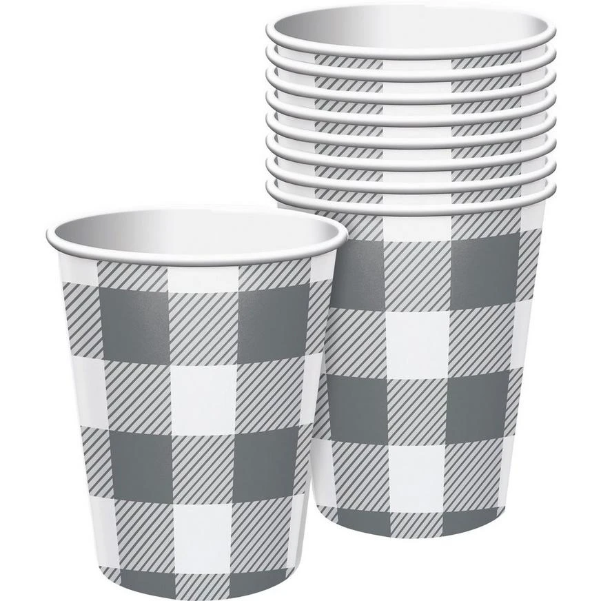 Create a subtle, classic beverage station with gray and white cups. The convenient paper cups feature an allover gray and white plaid pattern. Place paper cups next to place settings or leave a stack at the bar for easy cleanup.