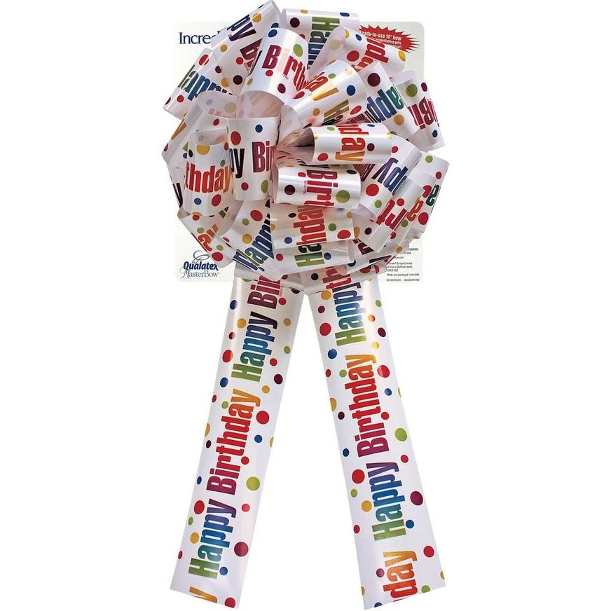 Let your gift wish them a happy birthday with our Happy Birthday Gift Bow! This celebratory gift decoration features a round layered loop bow design with ribbon tails that hang from the bottom. White with multicolor dots and “Happy Birthday” text allover, this fun bow makes a great gift topper for special birthday presents! Happy Birthday Gift Bow measures 10in long.