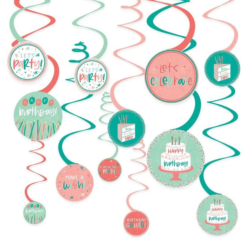 Complete the pastel look for your party with hanging swirl decorations! The cardstock spirals are blue, green, orange, and pink and feature headlines like “Let’s celebrate” and “Make a wish.” Hang these swirl decorations from the ceiling to complete the rest of your birthday decor!