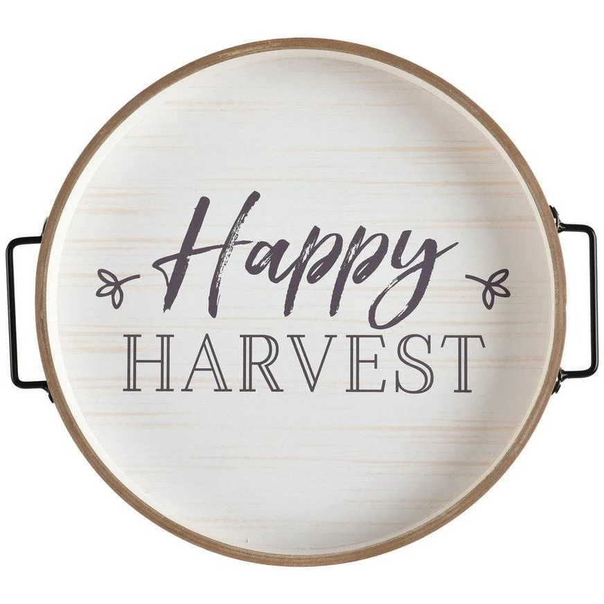 Fall in love with entertaining! This serving tray features the phrase “Happy Harvest” in gray font on a creamy wood-like background. Metal handles make it easy to carry.