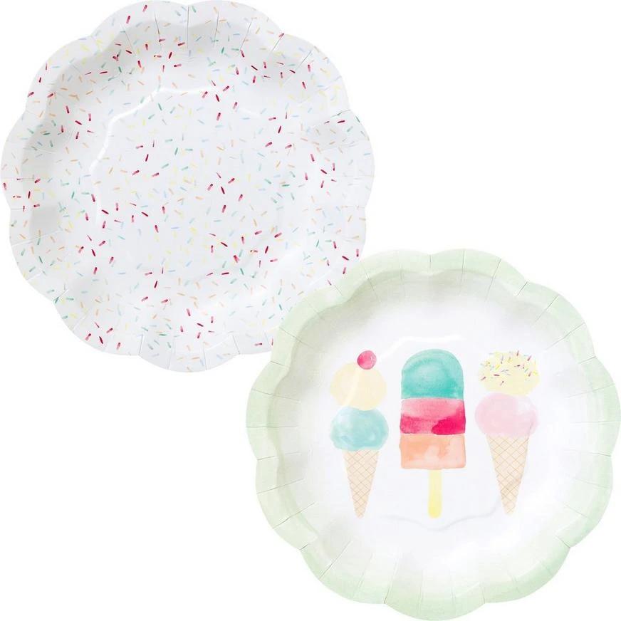 Serve some cake a la mode at your ice cream party using these Ice Cream Dessert Plates! These small round paper plates have a scalloped edge and come in two different designs. One design features colorful sprinkles against a white background and the other design features two colorful ice cream cones and an ice pop with a green border along the edges. Enjoy delicious desserts at your ice cream party using these plates!