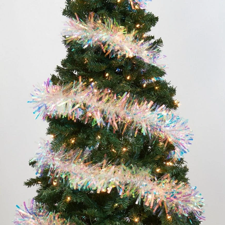 Add shimmering Christmas color to any space with the Iridescent Tinsel Pom-Pom Garland! With iridescent tinsel reminiscent of snow fairy crystals, this garland looks magical wrapped around the tree, draped over the mantelpiece, or on the buffet.
